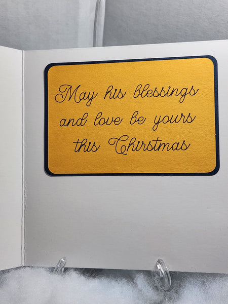 • The message is printed on a yellow rectangular section bordered in dark blue, creating a rich and festive contrast.
