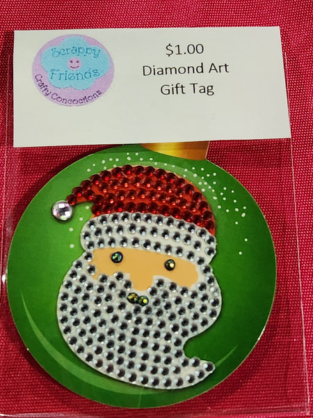 The circular tag showcases a stylized Santa Claus face made with shiny rhinestones.
