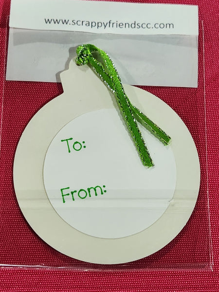 - A green & silver ribbon is attached to the tag, making it easy to tie onto gifts.